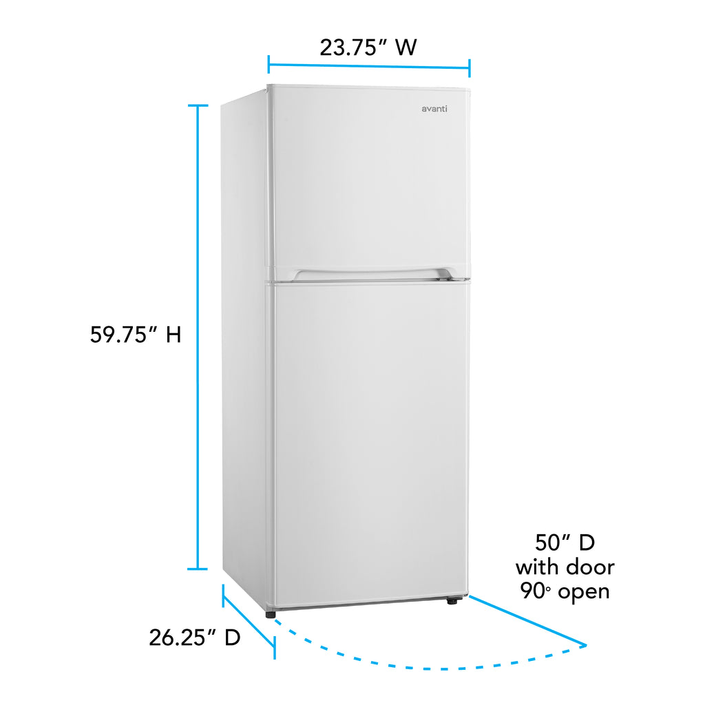 Store your favorite food and beverages in this 10.0 cubic feet refrigerator from Avanti. The perfect apartment size refrigerator, your food, and beverages stay fresh and cold thanks to the frost-free defrost system. The top-mounted freezer section is the ideal solution when it comes to saving money and storing frozen food in bulk. The full-width door bins make storing beverages easy and can accommodate 2-liter and gallon bottles. The two adjustable glass shelves and two clear view storage crispers allow you to arrange salads, fruits, snacks, and other food for easy access throughout the day. Select the right settings for your items with the electronic temperature control.