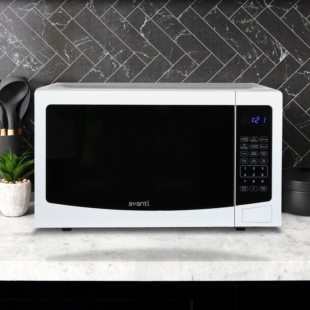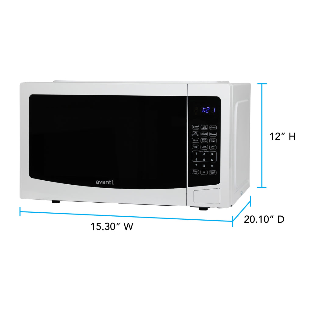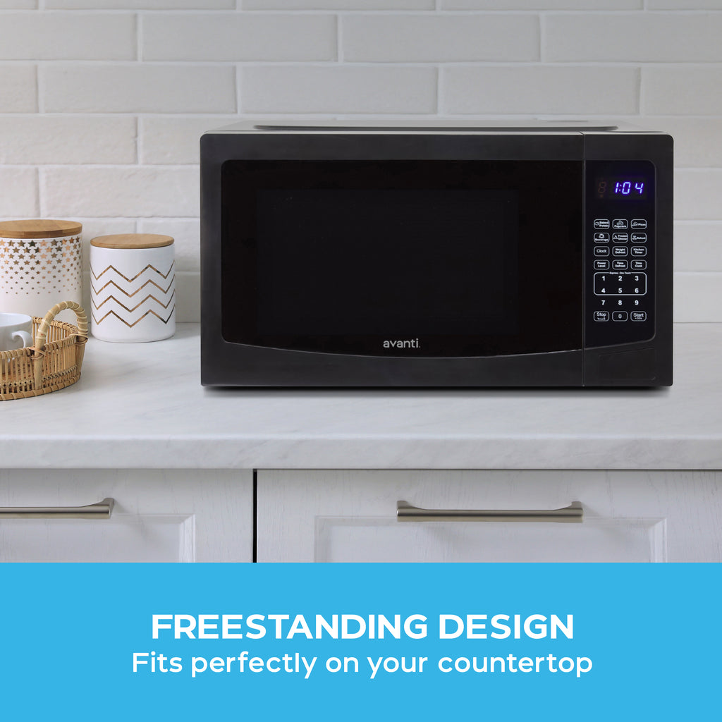 Save counter space with this compact microwave oven from Avanti. This 1.1 cubic foot microwave is perfect for the dorm, man cave, office, studio apartment, RV, tiny home, rental room, condo and more. This small microwave features 1000 watts of cooking power, an easy-to-use electronic control panel and 6 pre-set cooking settings (baked potato, popcorn, pizza, beverage, frozen dinner and reheat). The turntable with a glass tray ensures your food is heated evenly. This freestanding microwave fits perfectly on the countertop. Covered by the Avanti One-Year Limited Warranty.