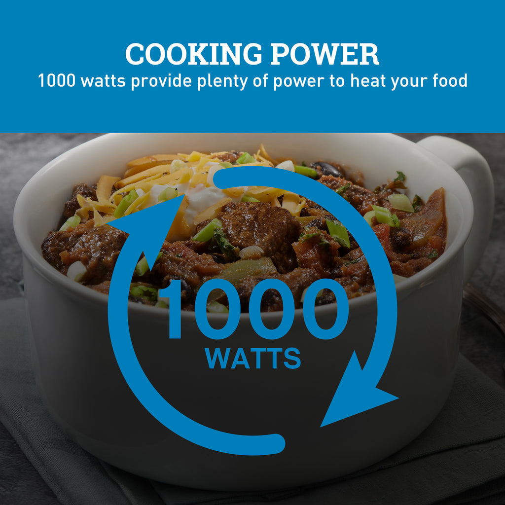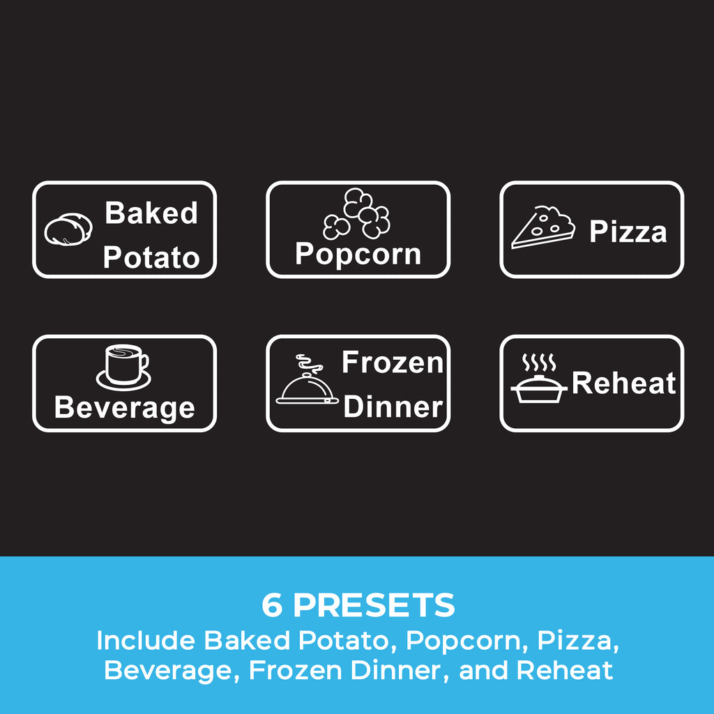 - 6 pre-programmed cooking settings include baked potato, popcorn, pizza, beverage, frozen dinner and reheat
