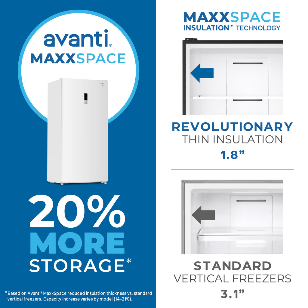 The Avanti MaxxSpace Insulation Technology Garage Ready 17 cu. ft. Frost Free Convertible Upright Freezer/Refrigerator offers unparalleled storage space without compromising on footprint. The convertible design allows seamless switching between refrigerator and freezer mode, providing ultimate flexibility for your needs. MaxxSpace Insulation Technology is a game-changer, offering enhanced energy efficiency, increased capacity, and a smaller product footprint. The insulation technology is 50% thinner, creating an ultra-thin barrier that greatly reduces heat transfer, resulting in a slimmer and quieter appliance, saving you money on energy bills. Not just spacious, the Avanti Upright Freezer/Refrigerator is also designed to be garage-ready, ensuring optimal performance even in extreme ambient temperatures. The frost-free technology prevents icy build-up and freezer burn, maintaining the freshness of your products. The rapid Turbo Freeze feature locks in food freshness, while the electronic controls allow for precise temperature management. Convenient features include LED lighting for clear visibility, high temperature and door opening alarms for added safety and a stylish recessed handle. Using the environmentally friendly R600a refrigerant, while being ENERGY STAR certified means it meets the highest energy efficiency standards. The Avanti MaxxSpace Insulation Technology Garage Ready 17 cu. ft. Frost Free Convertible Upright Freezer/Refrigerator is a versatile, energy-saving, convertible, and spacious appliance that offers exceptional value and performance for any space. Experience the MaxxSpace difference and enjoy a quieter, more efficient, and more spacious freezer/refrigerator.