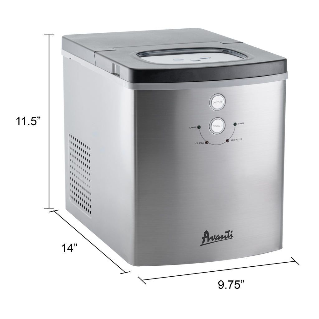 The Avanti Portable Countertop Ice Maker produces up to 33 pounds of ice daily, so you always have a supply of ice on hand. This compact ice maker is ideal for kitchen countertops as well as outdoor patios, offices, break rooms, dorms or anywhere you need extra ice. It's easily portable and quickly produces a batch of ice in just 9 minutes, making it perfect for events and entertaining. The countertop ice cube maker produces both small and large ice cubes to suit your needs. The unit features easy-to-use digital touch controls. It has indicator lights for both ice and water levels, so you can easily monitor your ice and know when to refill the water reservoir. The self-cleaning function ensures clean and fresh-tasting ice every time, and the included ice scoop makes it simple and sanitary to scoop ice cubes. This ice maker complements any decor. Covered by the Avanti One-Year Limited Warranty.